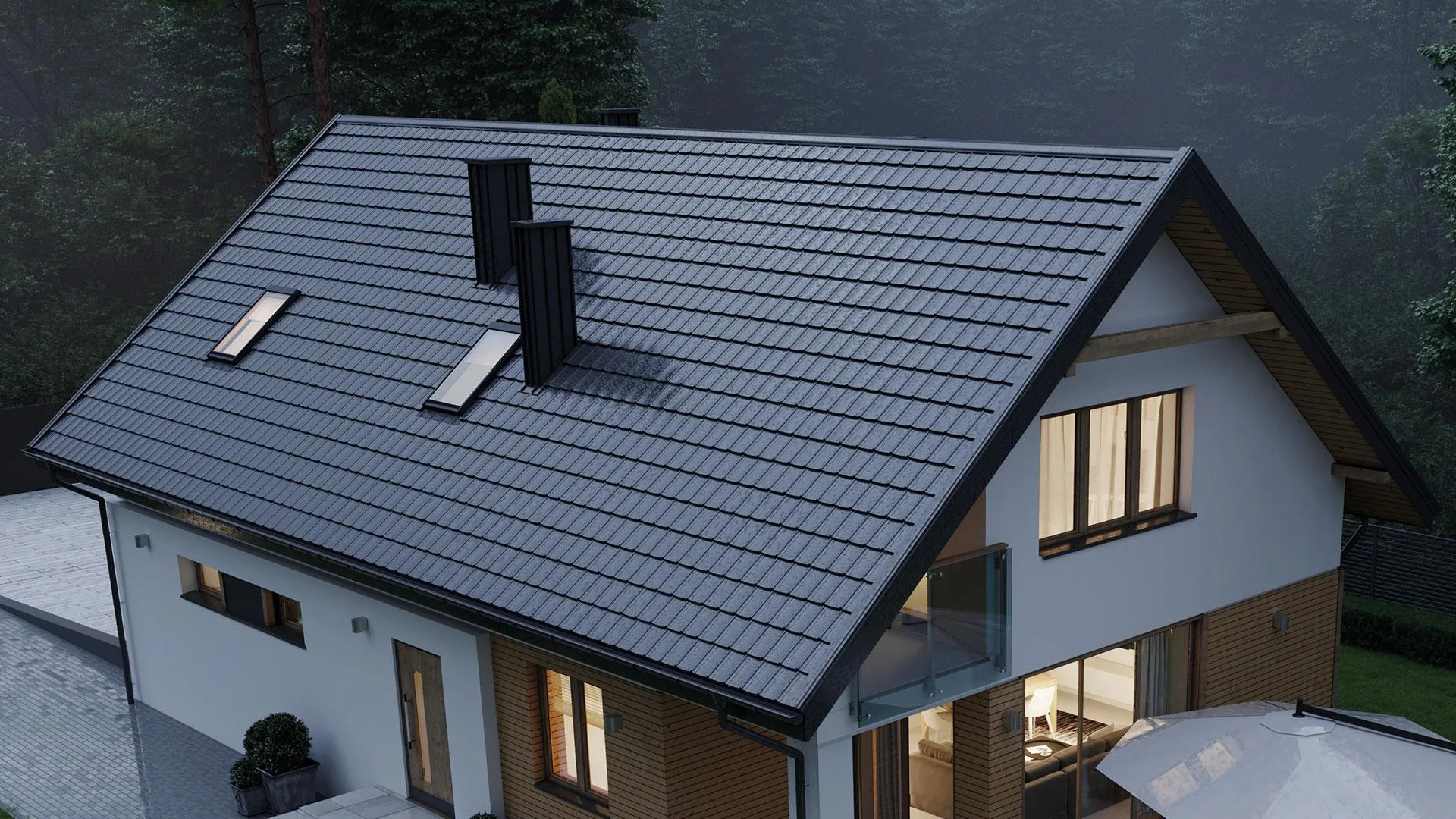 Nowoczesna wielkoformatowa ceramiczna dachówka płaska w kolorze czarnej angoby szlachetnej. Ułożona na połaci tworzy wrażenie gładkiego, prawie pozbawionego faktury dachu.