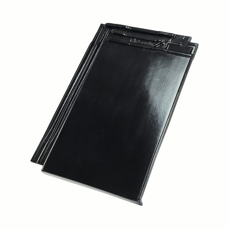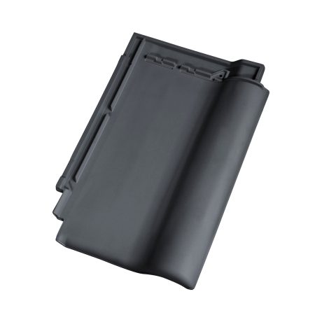 Nowoczesna wielkoformatowa ceramiczna dachówka płaska w kolorze czarnej angoby szlachetnej. Ułożona na połaci tworzy wrażenie gładkiego, prawie pozbawionego faktury dachu.